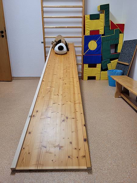 Hier können Sie unseren Bewegungraum sehen. Besonders freuen wir uns über die neu dazu gekommene schiefe Ebene.